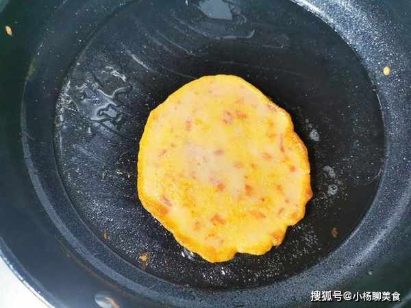 4、一面定型之後,我們翻面煎,一定要開小火,不然容易糊,直到兩面都成熟即可,大約需要1-2分鐘時間,麵糊不要攤得太厚了。