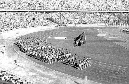 1959年9月13日,第一届全國運動會在剛剛落成的北京工人體育場隆重開幕。毛澤東、周恩來等黨和國家領導人出現在主席臺上,蘇聯、法國等24個友好國家和地區也派出代表團參加開幕式。