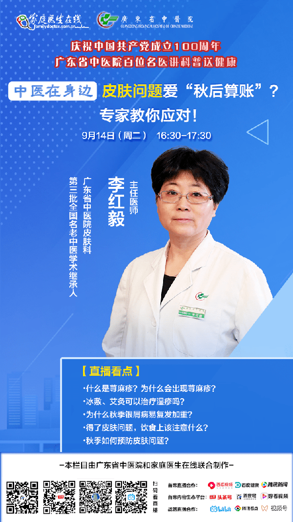 正值入秋之際,廣東省中醫院聯合家庭醫生線上推出秋季如何應對皮膚病直播活動,邀請了廣東省中醫院皮膚科主任醫師李紅毅,於9月14日16:30-17:30進行直播,為大家科普正確應對秋季高發皮膚問題相關知識,歡迎大家準時收看!