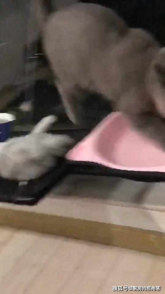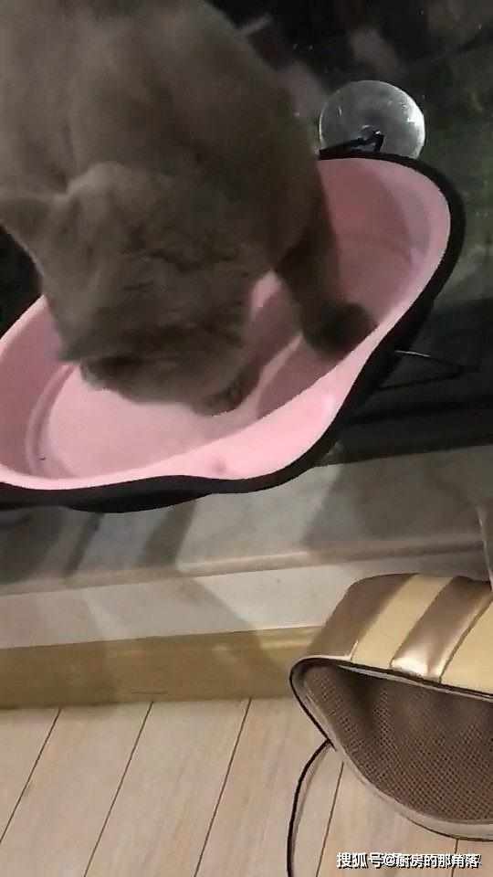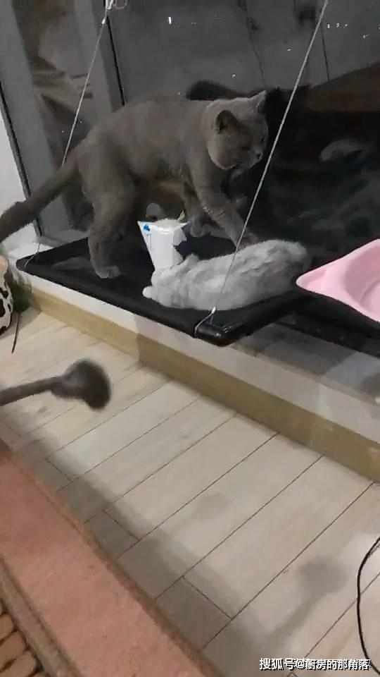 按道理當體積龐大的動物碰到比自己嬌小的小動物們一般都是以大欺小,而下麵這只大灰猫似乎是個特例。只見大灰猫與淺灰色的小猫都待在半空中的黑色猫架上。夜幕降臨,天色已晚,大灰猫必須要回到自己粉色的猫窩中休息了。