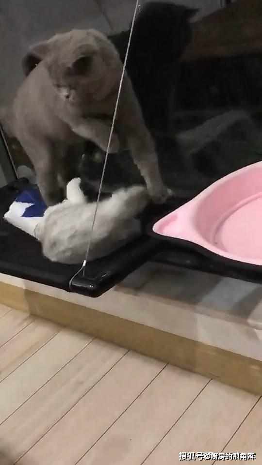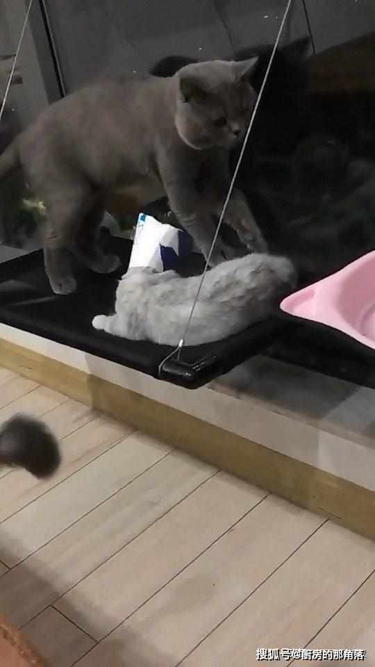 大灰猫不知道在懼怕著什麼,見到小灰猫不斷地在騷擾自己,拼命地擺動著四肢在做反抗,抓准時機快速的跨越過小灰猫,跳入到自己的粉紅小窩中。