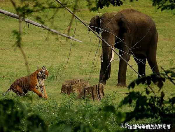 圖:面對體型較大的大象,老虎不敢貿然行動