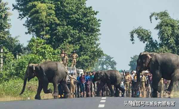 圖:印度西孟加拉邦,成年亞洲象護送著幼象穿越公路