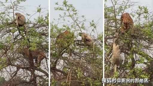 ?圖:一隻孟加拉虎爬到樹上試圖捕殺猴子
