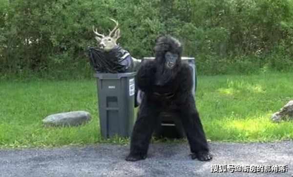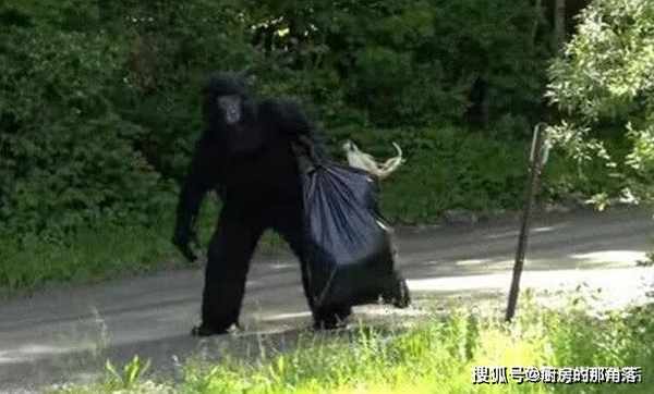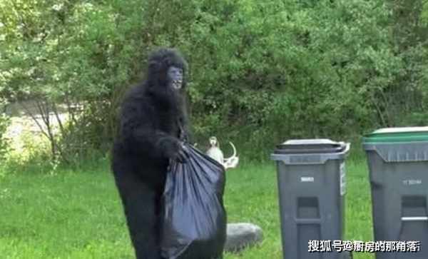 大猩猩手裡提著一個很大的黑塑胶袋,那走路的姿勢和人類簡直一模一樣,大猩猩把袋子扔到了垃圾桶。