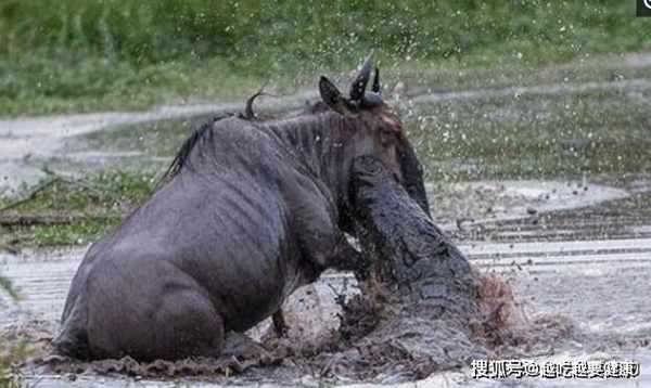 此時的水下,鱷魚一直在專心的盯著角馬的一舉一動,在尋找一個合適的機會,想要將角馬一擊斃命。