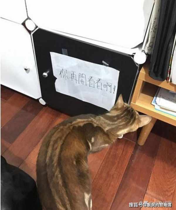 三番五次之後,小猫咪鑽衣櫃睡覺這個行為就成了習慣,每天都要去。忍無可忍之下,主人只好想了點招數來對付小猫咪。主人找了一塊木板,把它做成和衣櫃門一般大小的模樣,用釘子釘在了衣櫃門之外,就像是給衣櫃上了保險一樣。這天,小猫咪如往常一樣去鑽衣櫃,走到門口發現不對勁,櫃子門上多了一個紙條,雖然它壓根看不懂寫的是什麼,但是還是猶豫了一下。