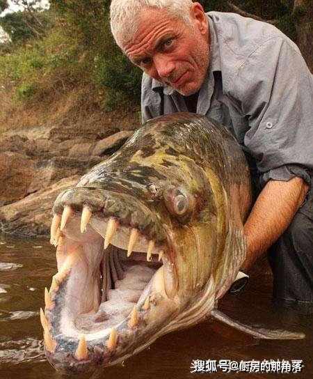 上圖這位英國老漢跑到非洲釣到了這條和成人差不多大的巨型水虎魚。這種魚十分兇猛,你看它的大嘴巴和滿嘴的尖牙利齒就知道了。