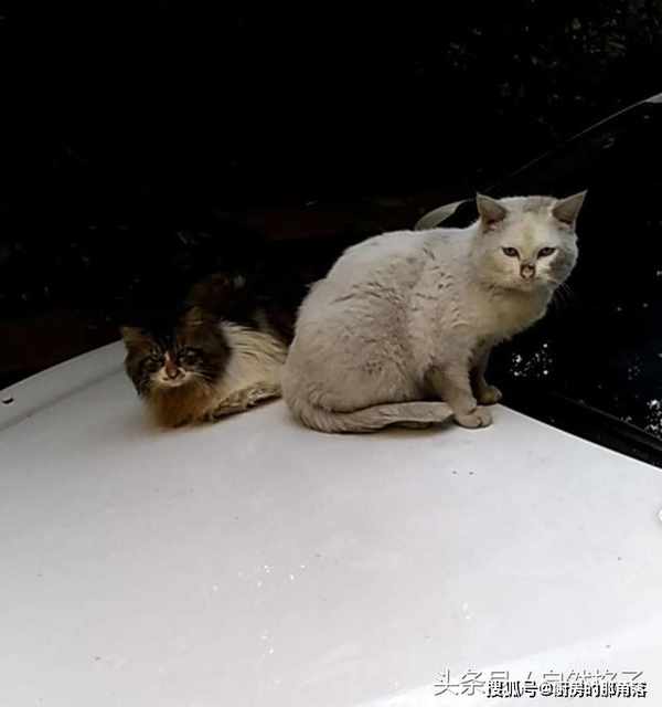 一比特朋友去開車,突然發現車上有兩隻猫在臥著睡覺:一隻花貓,一隻白猫,兩隻猫都很胖,但都是一身土。