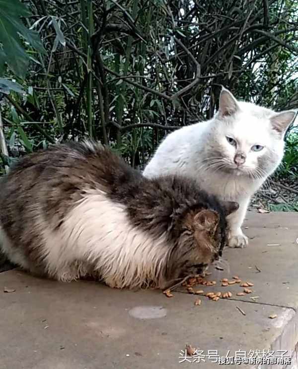 白猫吃了一會兒,抬起頭來盯著朋友手中剩下的貓糧。好像在說:大兄弟,再來一點,不够我們吃啊!