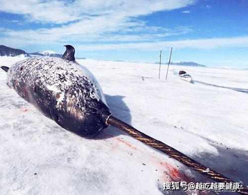 圖為慘死在愛斯基摩人手下的獨角鯨。鮮血染紅了白雪,可愛的小生命再也不能返回大海……