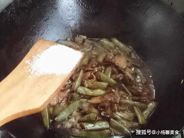 8.豆角熟,加鹽、味精炒均勻即可出鍋裝盤。