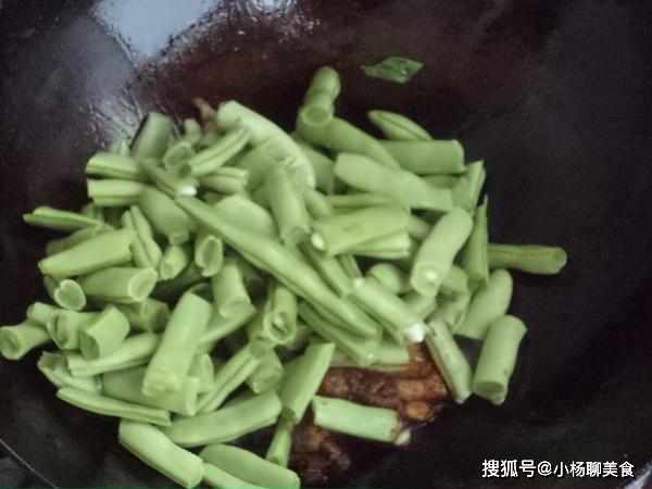 7.豆角入鍋炒。加適量水,炒均勻,蓋上鍋蓋燒。其間適時翻炒。