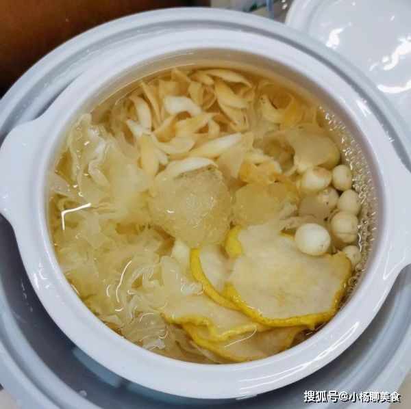 4.把銀耳、蓮子、百合、雪梨幹放入電燉鍋,加入適量的純淨水慢燉1.5小時即可。