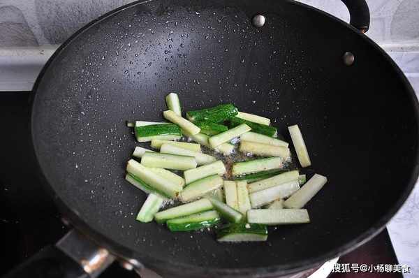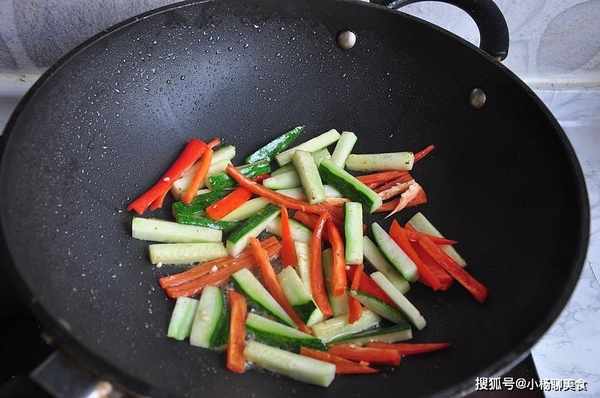 5黃瓜不要炒得火候太大,略變色即可,這時可以放入辣椒再略炒,加入一勺蚝油翻炒入味。
