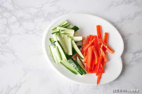 2黃瓜也切成比牛肉略細一點的長條,辣椒切成長段。我用的辣椒是長紅椒,微微辣,主要是為了與黃瓜配色。如果您喜歡辣一點,也可以用別的辣椒,但不建議太重,會搶了牛肉的香味。
