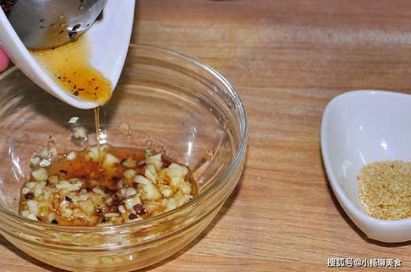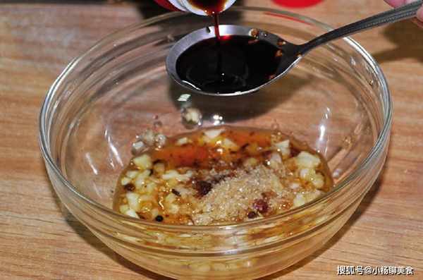 花椒油首先加入蒜末中,再加一點糖、黑醋、醬油、檸檬汁,親試口味再稍做調整。(因人而異,也可加些辣)