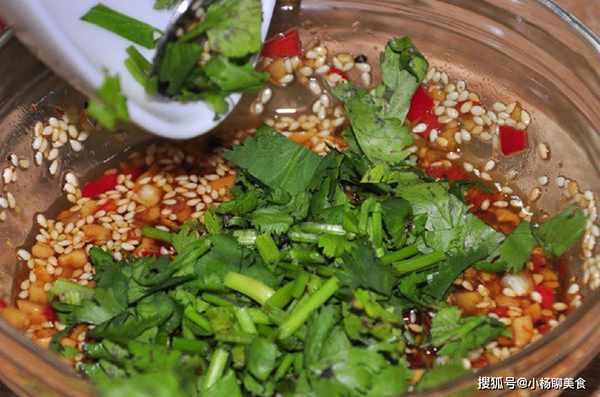 同時把辣椒、花生、芝麻均勻拌入醬汁中。
