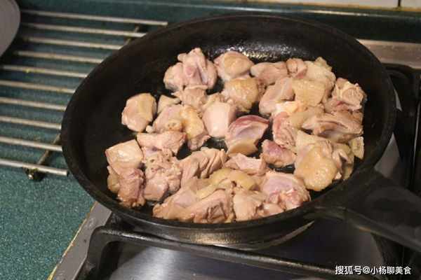 Step4.雞腿肉切小塊,將雞肉煎至變色微焦,備用。
