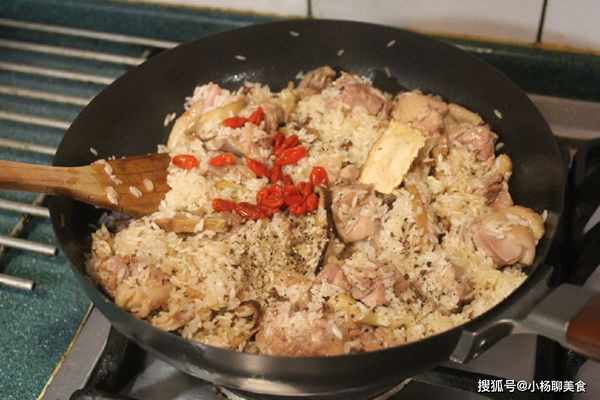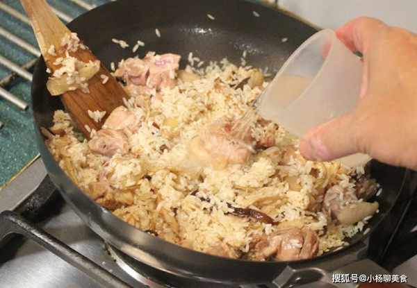 Step13.將拌炒好的麻油雞飯移至電鍋內鍋,加入香菇水1.5杯。外鍋放1.2米杯的水,用電鍋將飯煮熟。
