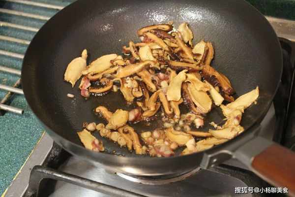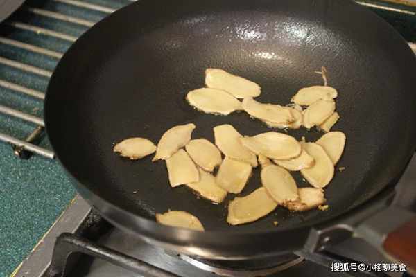 Step5..先用白麻油2大匙將薑片小火慢慢煸香,煸至薑片快要捲曲。