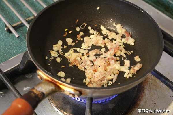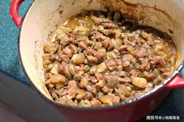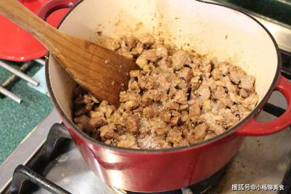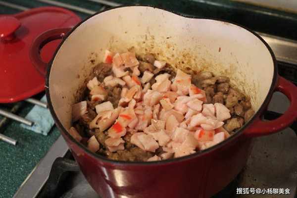 Step7.加入猪皮丁,除了可以豐富風味跟口感,也多了許多膠質。