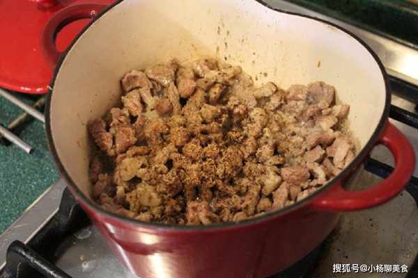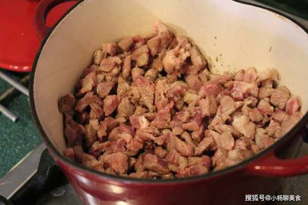 Step3.將燉鍋加熱後,加一些油將梅花肉丁炒到肉色全部變白。
