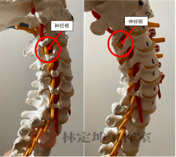 當頸椎處於正中比特(左圖)的時候,椎間孔結構穩定,在沒有其他骨質或韌帶增生嚴重的情况下,神經根都可以順利通過這個小孔,向外伸展到達上肢。