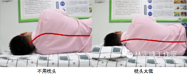 從圖2中可以看到,在側睡時,如果枕頭過低,頸椎就會出現側彎的情况。