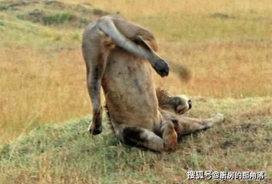 一隻獅子在捕食獵物,由於奔跑速度太快加上脚下太滑,一頭栽倒在地上。
