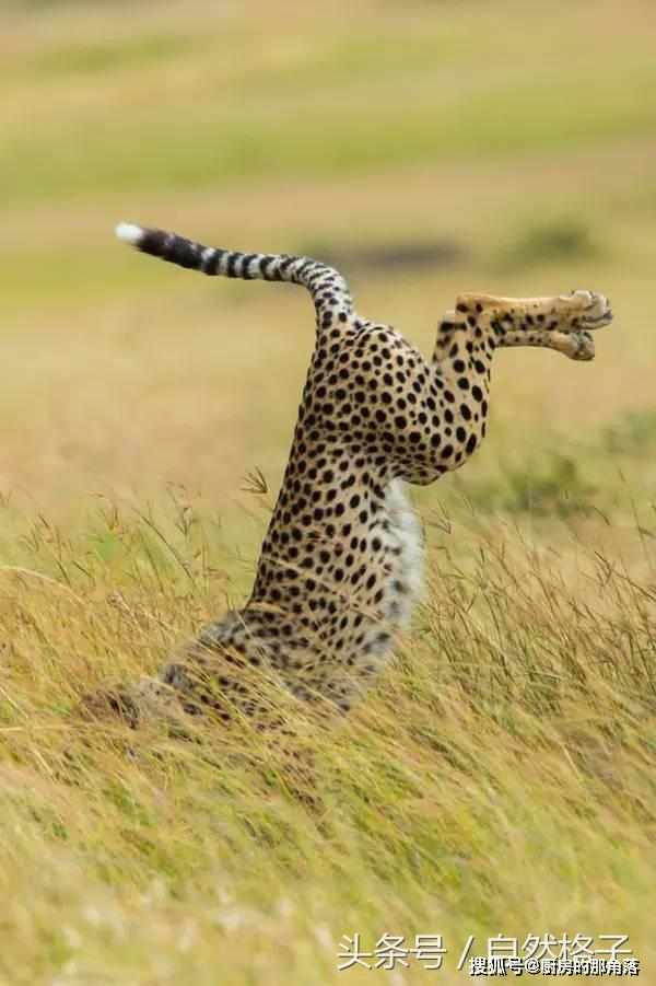 一頭獵豹在快速奔跑中栽了跟頭,草叢埋沒了它的頭,所以我們無法看清它此時的囧樣。