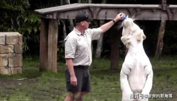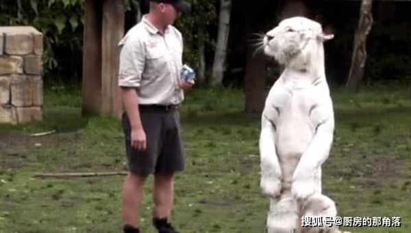 白虎遠遠的看到飼養員的手裡拿了一盒牛奶,眼睛就一直直勾勾的盯著他,等到飼養員來到自己面前的時候,這頭白虎居然一下子坐直了身體,兩隻前爪捧在身體前面,就好像是狗狗在討要食物時候作揖一樣。這樣的動作把白虎園外的遊客都引的哈哈大笑。