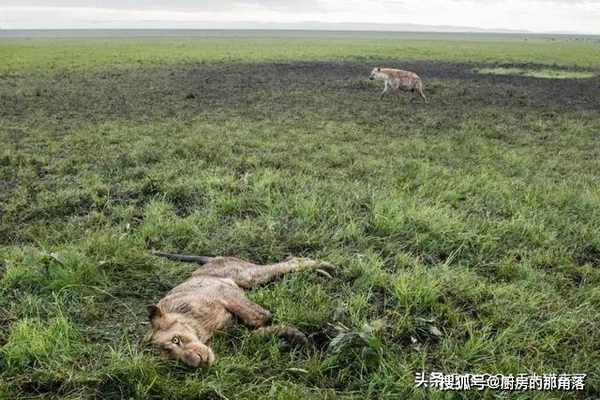 圖:一隻獅子因捕殺了牛被牧民下毒殺死,不遠處有一隻等待機會的鬣狗