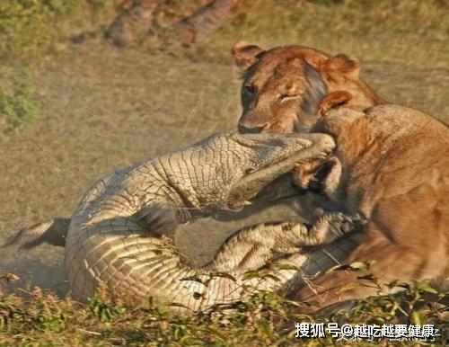 【被獅子圍攻】圖中這條鱷魚想要偷襲一隻小獅子,不料被母獅們發現,於是三只母獅與鱷魚展開了搏鬥。雖然鱷魚有著盔甲護體,但十多分鐘後,這條鱷魚還是被母獅們咬死。