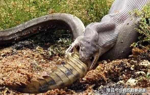 【葬身蟒腹】鱷魚的胃口不小,蟒蛇的胃口更大。圖中的這條巨大的蟒蛇將一條同樣巨大的鱷魚活活勒死,然後張開它的大口,慢慢將鱷魚整個吞進肚子裏。吃了這一餐,這條蟒蛇可以很久都不用進食了。