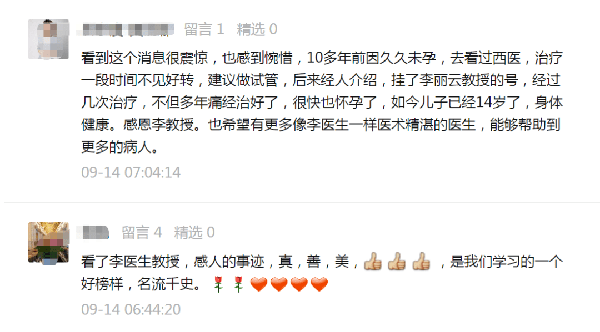 在患者圈裏,大家都親切地稱呼李麗芸教授"李奶奶"。9月11日,李教授去世的消息一經醫院官方平臺發佈,短短一小時內,關注量超過7萬,留言數千條。很多留言者都是因得到李教授的幫助而圓了做媽媽的夢想。大家深情緬懷備受患者尊敬、愛戴的李教授。