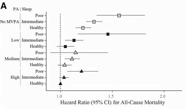 而對於那些睡眠品質較差的人而言,多運動或許能成為一個突破口,資料對比:達到600MET閾值的參與者,睡眠差與死亡之間的有害關聯被消解了大半。