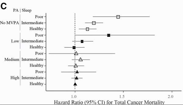 最終通過結論分析---對比高運動水准+高睡眠品質的人對比,睡不好還不運動的全因死亡風險升高57%、因心血管疾病死亡風險升高67%、因癌症死亡風險升高45%、因肺癌死亡風險升高91%有關。