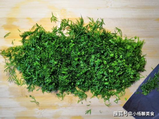 1,我們先把茴香苗摘乾淨,去掉老葉子和根部,只要比較嫩的葉子和細杆,摘好以後把它洗清乾淨並瀝幹水分,然後把它切碎放入大一點的碗中備用。