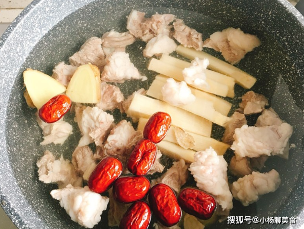 3,把焯好水的羊肉放入砂鍋中,加入清洗好的黃芪,桂圓,黨參,紅棗,還有甘蔗,再放幾片生薑,加入適量清水,不用蓋鍋蓋,先用大火煮開。