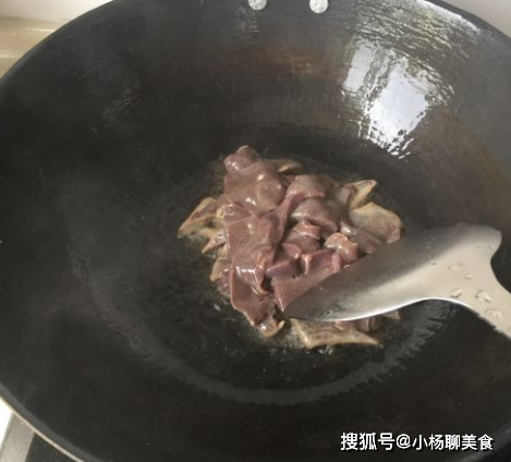 3,鍋中倒入適量的油,油熱之後下入猪肝,炒至猪肝斷生就把它盛出來裝在盤子裏。