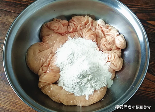 澱粉是比較滑的,加了澱粉之後,豬大腸上的黏液就不會沾在手上了,把那些黏液都處理乾淨了以後,用溫水沖洗乾淨,然後把豬大腸翻過來,把裡面的油都摘下來,處理好了以後,再把它翻過來,這樣豬大腸就清洗乾淨了,把清洗好的豬大腸放在盆中,加入適量的清水和高度白酒,讓它浸泡半個小時,這樣豬大腸就沒有一點腥臭味了。