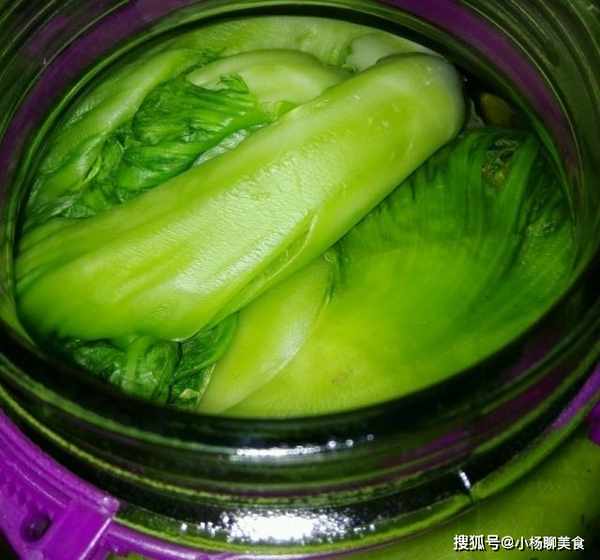 2、芥菜洗乾淨之後晾乾水分,然後用適量的食鹽輕輕的搓一下芥菜,能去除异味,然後把芥菜放到罎子裏,把準備好的洗米水倒入罎子裏,然後倒入20g的高度白酒,然後放到陰涼通風的地方靜置兩天,讓其發酵。
