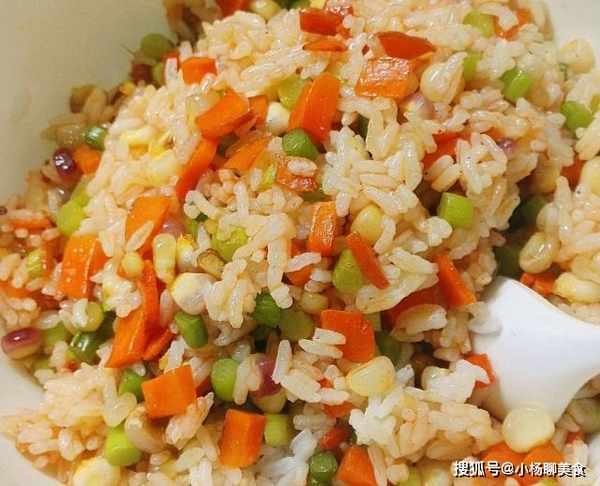 2、蔬菜炒好之後倒入剩米飯繼續翻炒,將米飯炒散,然後加入適量的食鹽、雞精、白胡椒粉和番茄醬炒勻,炒好關火盛出。