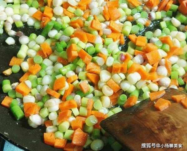 1、我們先來做炒飯,準備一碗剩米飯,再準備愛吃的配菜,我這裡用了胡蘿蔔丁、玉米粒和火腿腸丁、蒜苔丁,食材全部準備好之後我們將鍋燒熱,倒入適量的植物油,油燒至七成熱的時候倒入全部的配菜進行翻炒。