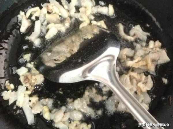 步驟五:然後倒入肉絲,翻炒到肉絲變色,倒入適量醬油,炒勻上色。