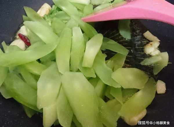 步驟四:然後倒入萵苣,大火快速翻炒,一直等到萵苣變色。