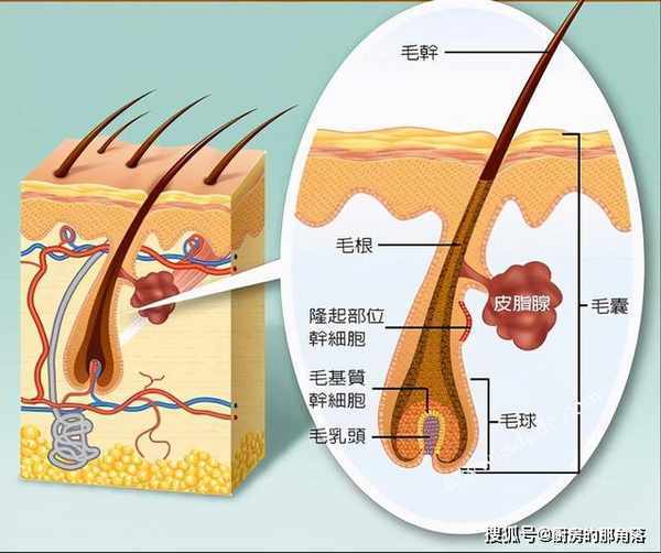 人的身體共有約500萬個毛囊,其中100萬分佈在頭部,10萬至15萬個位於頭皮。毛囊為包裹在毛髮根部周圍的鞘狀結構,由內至外分為內毛根鞘、外毛根鞘及纖維鞘構成。簡單通俗一點地講,就是每個毛囊裡面有一群毛囊幹細胞,是一個相當複雜的"迷你組織"。這些毛囊幹細胞,能不斷分裂給生長中的毛囊提供源源不斷的細胞,這些新細胞可以分化為毛髮、皮脂腺、黑色素細胞、平滑肌細胞等,具有多重分化的潜能。