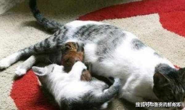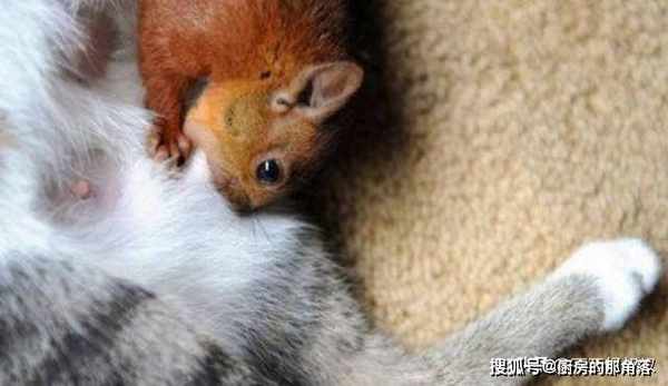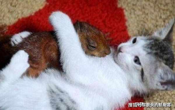 圖中這只猫咪在前幾日陞級當了猫媽媽,但是細心的小主們應該發現了,猫媽媽懷中的抱的不是小奶猫,而是一隻棕色的小松鼠。看著小松鼠躲在猫媽媽懷裡的樣子,這場面可是很溫馨呢!