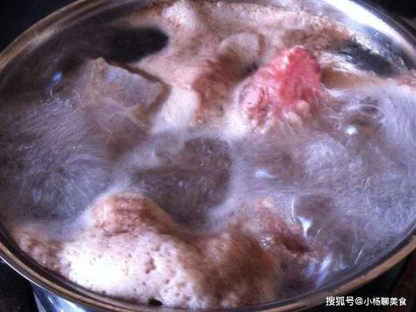 步驟二:鍋內天冷水,放入牛肉,大火燒開,直到煮出浮沫和血水,撈出牛肉控幹水分。
